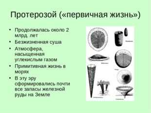 Описание слайда:Протерозой («первичная жизнь») Продолжалась около 2 млрд. лет Безжизненная суша Атмосфера, насыщенная углекислым газом Примитивная жизнь в морях В эту эру сформировались почти все запасы железной руды на Земле