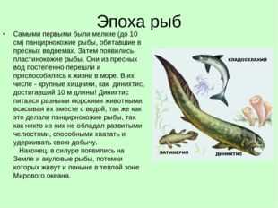 Описание слайда:Эпоха рыб Самыми первыми были мелкие (до 10 см) панцирнокожие рыбы, обитавшие в пресных водоемах. Затем появились пластинокожие рыбы. Они из пресных вод постепенно перешли и приспособились к жизни в море. В их числе – крупные хищники, как динихтис, достигавший 10 м длины! Динихтис питался разными морскими животными, всасывая их вместе с водой, так же как это делали панцирнокожие рыбы, так как никто из них не обладал развитыми челюстями, способными хватать и удерживать свою добычу. Наконец, в силуре появились на Земле и акуловые рыбы, потомки которых живут и поныне в теплой зоне Мирового океана.