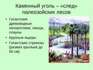 Описание слайда:Каменный уголь – «след» палеозойских лесов Гигантские древовидные папоротники, хвощи, плауны Крупные ящеры Гигантские стрекозы (размах крыльев до 60 см)