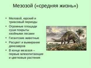 Описание слайда:Мезозой («средняя жизнь») Меловой, юрский и триасовый периоды Огромные площади суши покрыты хвойными лесами Гигантские животные Расцвет и вымирание динозавров В конце мезозоя – первые млекопитающие и цветковые растения