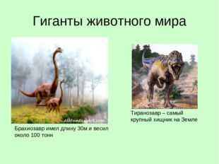 Описание слайда:Гиганты животного мира Брахиозавр имел длину 30м и весил около 100 тонн Тиранозавр – самый крупный хищник на Земле
