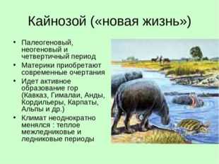 Описание слайда:Кайнозой («новая жизнь») Палеогеновый, неогеновый и четвертичный период Материки приобретают современные очертания Идет активное образование гор (Кавказ, Гималаи, Анды, Кордильеры, Карпаты, Альпы и др.) Климат неоднократно менялся : теплое межледниковье и ледниковые периоды