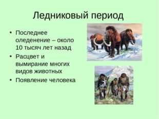 Описание слайда:Ледниковый период Последнее оледенение – около 10 тысяч лет назад Расцвет и вымирание многих видов животных Появление человека