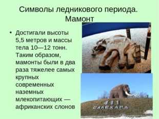 Описание слайда:Символы ледникового периода. Мамонт Достигали высоты 5,5 метров и массы тела 10—12 тонн. Таким образом, мамонты были в два раза тяжелее самых крупных современных наземных млекопитающих — африканских слонов
