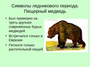 Описание слайда:Символы ледникового периода. Пещерный медведь Был примерно на треть крупнее современных бурых медведей. Встречался только в Евразии Питался только растительной пищей