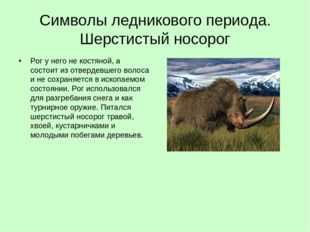 Описание слайда:Символы ледникового периода. Шерстистый носорог Рог у него не костяной, а состоит из отвердевшего волоса и не сохраняется в ископаемом состоянии. Рог использовался для разгребания снега и как турнирное оружие. Питался шерстистый носорог травой, хвоей, кустарничками и молодыми побегами деревьев.