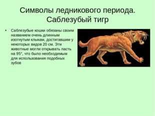 Описание слайда:Символы ледникового периода. Саблезубый тигр Саблезубые кошки обязаны своим названием очень длинным изогнутым клыкам, достигавшим у некоторых видов 20 см. Эти животные могли открывать пасть на 95°, что было необходимым для использования подобных зубов