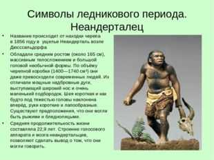Описание слайда:Символы ледникового периода. Неандерталец Название происходит от находки черепа в 1856 году в ущелье Неандерталь возле Дюсссельдорфа Обладали средним ростом (около 165 см), массивным телосложением и большой головой необычной формы. По объёму черепной коробки (1400—1740 см³) они даже превосходили современных людей. Их отличали мощные надбровные дуги, выступающий широкий нос и очень маленький подбородок. Шея короткая и как будто под тяжестью головы наклонена вперёд, руки короткие и лапообразные. Существуют предположения, что они могли быть рыжими и бледнолицыми. Средняя продолжительность жизни составляла 22,9 лет. Строение голосового аппарата и мозга неандертальцев, позволяют сделать вывод о том, что они могли говорить.