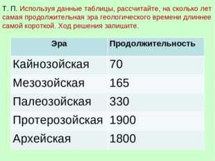 Описание слайда:Т. П. Используя данные таблицы, рассчитайте, на сколько лет самая продолжительная эра геологического времени длиннее самой короткой. Ход решения запишите. Эра Продолжительность Кайнозойская 70 Мезозойская 165 Палеозойская 330 Протерозойская 1900 Архейская 1800
