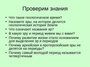 Описание слайда:Проверим знания Что такое геологическое время? Назовите эры, на которое делится геологическая история Земли Что означают названия эр? В какую эру и период живем мы с вами? Почему развитие жизни стало основанием для выделения эр и периодов Почему архейская и протерозойская эры не делятся на периоды? Почему самый молодой период называется четвертичным