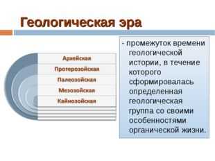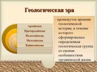 Описание слайда:Геологическая эра – промежуток времени геологической истории, в течение которого сформировалась определенная геологическая группа со своими особенностями органической жизни.