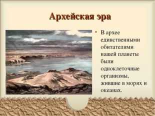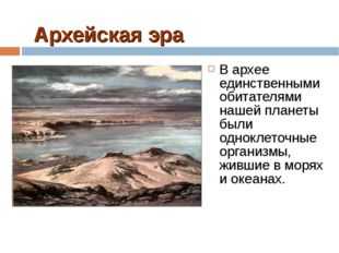 Архейская эра В архее единственными обитателями нашей планеты были одноклеточные организмы, жившие в морях и океанах.
