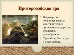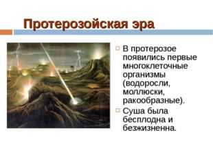 Описание слайда:Протерозойская эра В протерозое появились первые многоклеточные организмы (водоросли, моллюски, ракообразные). Суша была бесплодна и безжизненна.