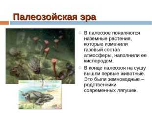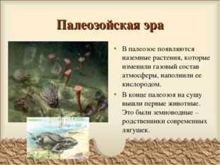 Описание слайда:Палеозойская эра В палеозое появляются наземные растения, которые изменили газовый состав атмосферы, наполнили ее кислородом. В конце палеозоя на сушу вышли первые животные. Это были земноводные – родственники современных лягушек.