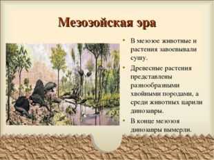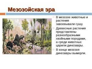 Описание слайда:Мезозойская эра В мезозое животные и растения завоевывали сушу. Древесные растения представлены разнообразными хвойными породами, а среди животных царили динозавры. В конце мезозоя динозавры вымерли.