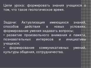 Описание слайда:Цели урока: формировать знания учащихся о том, что такое геологическое время. Задачи: Актуализация имеющихся знаний, способов действия в новых условиях; формирование умения задавать вопросы; • развитие произвольного внимания и памяти, познавательных интересов и инициативы учащихся; • формирование коммуникативных умений, культуры общения, сотрудничества.
