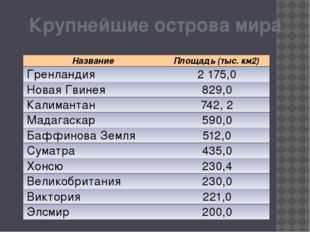 Описание слайда:Крупнейшие острова мира Название Площадь(тыс. км2) Гренландия 2175,0 НоваяГвинея 829,0 Калимантан 742, 2 Мадагаскар 590,0 БаффиноваЗемля 512,0 Суматра 435,0 Хонсю 230,4 Великобритания 230,0 Виктория 221,0 Элсмир 200,0