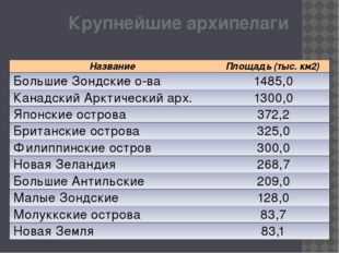 Описание слайда:Крупнейшие архипелаги Название Площадь(тыс. км2) БольшиеЗондскиео-ва 1485,0 Канадский Арктический арх. 1300,0 Японские острова 372,2 Британские острова 325,0 Филиппинские остров 300,0 Новая Зеландия 268,7 Большие Антильские 209,0 МалыеЗондские 128,0 Молуккские острова 83,7 Новая Земля 83,1