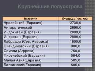 Описание слайда:Крупнейшие полуострова Название Площадь(тыс. км2) Аравийский (Евразия) 2730,0 Антарктический 2690,0 Индокитай (Евразия) 2088,0 Индостан (Евразия) 2000,0 Лабрадор (Сев. Америка) 1600,0 Скандинавский (Евразия) 800,0 Сомали (Африка) 750,0 Пиренейский (Евразия) 584,0 Малая Азия(Евразия) 505,0 Балканский(Евразия) 505,0