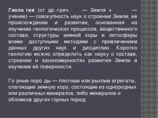 Описание слайда:Геоло́гия (от др.-греч. γῆ — Земля + λόγος — учение) — совокупность наук о строении Земли, её происхождении и развитии, основанная на изучении геологических процессов, вещественного состава, структуры земной коры и литосферы всеми доступными методами с привлечением данных других наук и дисциплин. Коротко геологию можно определить как науку о составе, строении и закономерностях развития Земли и изучение её поверхности. Го́рные поро́ды — плотные или рыхлые агрегаты, слагающие земную кору, состоящие из однородных или различных минералов, либо минералов и обломков других горных пород.