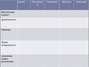 Описание слайда:Архей Протерозой Палеозой Мезозой Кайнозой Абсолютныйвозраст Длительность Периоды Эпохи складчатости появление живых организмов