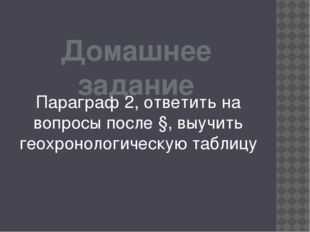 Описание слайда:Домашнее задание Параграф 2, ответить на вопросы после §, выучить геохронологическую таблицу