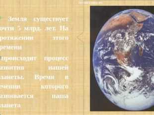 Описание слайда:Земля существует почти 5 млрд. лет. На протяжении этого времени происходит процесс развития нашей планеты. Время в течении которого развивается наша планета – называется
