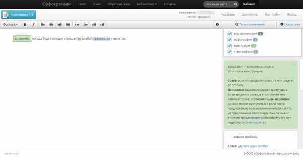 Орфограммка — это очень качественный сайт, предназначенный для проверки правильности написания текстов. Основными его качествами являются наглядность и простота. Все найденные ошибки по окончании проверки выделяются разными цветами. Кликнув мышкой по выделенному, слову вы можете прочитать все сведения об ошибке.