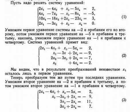 В школьных учебниках для 7 класса пример решения методом Гаусса описан следующим образом: