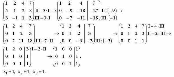 В итоге должна получиться матрица в которой по одной из диагоналей стоят 1, а все другие коэффициенты равны нулю, то есть матрицу приводят к единичному виду. Нельзя забывать производить вычисления с цифрами обеих частей уравнения.