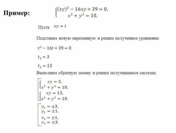 Из примера видно, что введя новую переменную t удалось свести 1-е уравнение системы к стандартному квадратному трехчлену. Решить многочлен можно отыскав дискриминант.