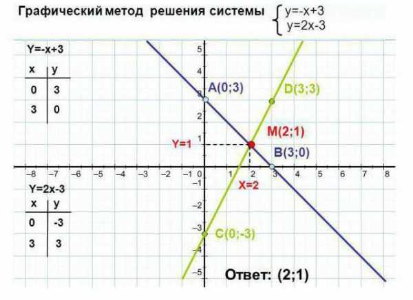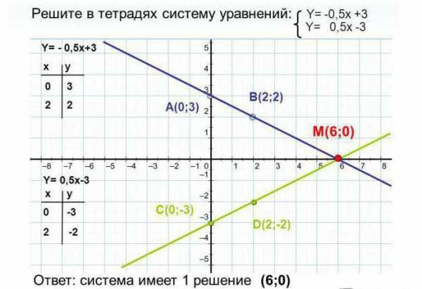 Системы из примеров 2 и 3 похожи, но при построении становится очевидно, что их решения разные. Следует помнить, что не всегда можно сказать имеет ли система решение или нет, всегда необходимо построить график.