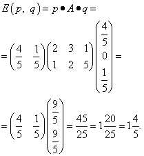 Если первый игрок использует смешанную стратегию p, а второй игрок – смешанную стратегию q, то имеет смысл математическое ожидание выигрыша первого игрока (проигрыша второго игрока). Чтобы его найти, нужно перемножить вектор смешанной стратении первого игрока (который будет матрицей из одной строки), платёжную матрицу и вектор смешанной стратегии второго игрока (который будет матрицей из одного столбца):
