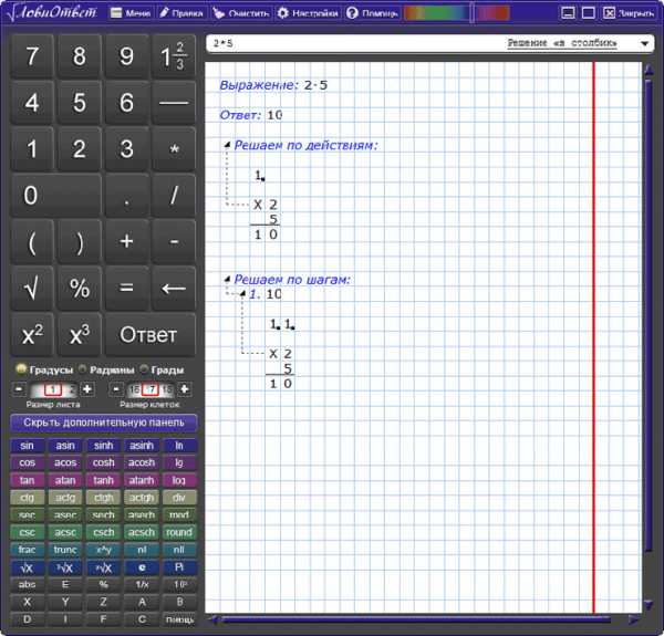 Калькулятор ЛовиОтвет решает математические примеры и уравнения с отображением этапов решения, производит наглядно вычисления “в столбик”. Вас приятно удивит результат решения – на разлинованном тетрадном листе вы увидите все что должен написать ученик или студент для решения примера. Отлично подходит как для проверки уже выполненных заданий, так и для, непосредственно, их выполнения.