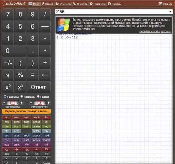 По заявлению производителя, версия Лови Ответ онлайн менее функциональна, чем программа, которая устанавливается на компьютер или мобильное устройство. Но, все равно, онлайн калькулятор может быть полезен в некоторых случаях, для выполнения решения поставленных задач.