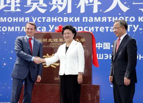 Сегодня был установлен памятный камень на месте строительства российско-китайского университета в городе Шэньчжэнь. В торжественной церемонии установки камня со стороны России участвовали: С.Е. Нарышкин, Н.В. Третьяк, ректор МГУ В.А. Садовничий и С.М. Шахрай – председатель Совета директоров и проректор МГУ. С китайской стороны в церемонии участвовала вице-премьер Государственного Совета КНР Лю Яньдун.