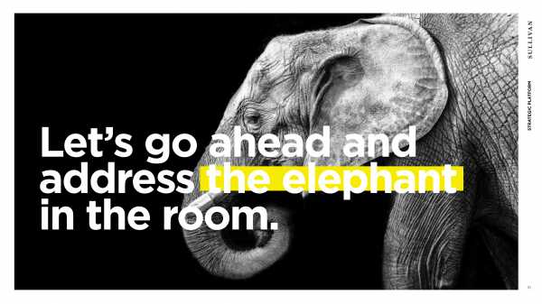 Творческие директора в Нью-Йоркского брендового агентства Sullivan советуют использовать определённе слайды просто чтобы связывать беседу (надпись на картинке — «Давайте оглядимся и обратимся к слону в комнате»).