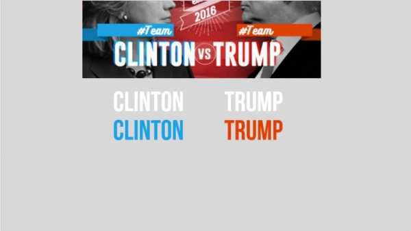 Цветовое разделение на два лагеря для лучшего визуального восприятия: красная подложка для Трампа, синяя — для Клинтон. Легко читается и воспринимается.