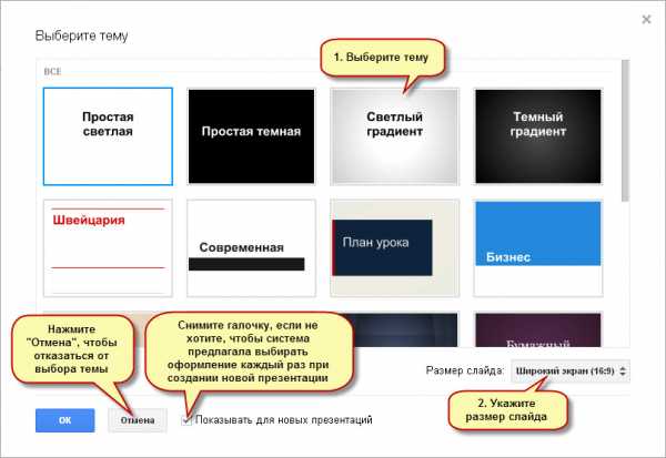 Система создаст новый файл и предложит выбрать тему оформлению и размер слайда. Если вы предпочитаете свое оформление, нажмите кнопку «Отмена».