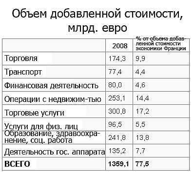 В 2010 году в этом секторе экономики Франции были заняты около 20,5 млн. человек, что составило 78% от их общего числа в стране. Этот показатель вырос на 30% по сравнению со статистическими данными экономики Франции за 1990 год, что свидетельствует о его постепенном развитии и усилении влияния на всю экономику Франции. В 2010 году на третичный сектор экономики Франции пришлось 65,7% от ВВП страны, или,в денежном эквиваленте, 2 300 млрд. евро. Что касается вклада в добавленную стоимость, то здесь вклад третичного сектора экономики Франции еще выше – в 2010 году он составил 79,7% от общегосударственного объема добавленной стоимости, или 1 385 млрд. евро, что делает его наиболее знаковым сектором в экономике Франции.