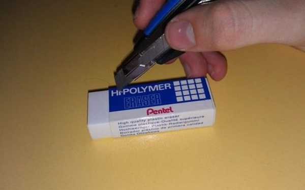- Вырежьте в ластике желоб, вложите в него гармошку-шпору – и пользуйтесь на здоровье. Все гениальное, известно, просто.