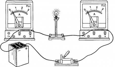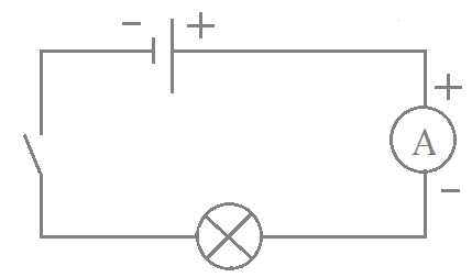 Включая амперметр в цепь постоянного тока, необходимо соблюдать полярность (см. рисунок): провод, который идёт от положительного полюса источника тока, нужно соединять с клеммой амперметра со знаком «+»; провод, который идёт от отрицательного полюса источника тока, нужно соединять с клеммой амперметра со знаком «-».