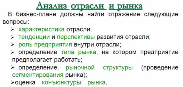 Что касается описания отрасли, здесь идет речь об ее специфических особенностях, современном состоянии, перспективах развития, уровне монополизма, капиталоемкости, технологической изменчивости и тенденциях в отраслевом сегменте рынка.