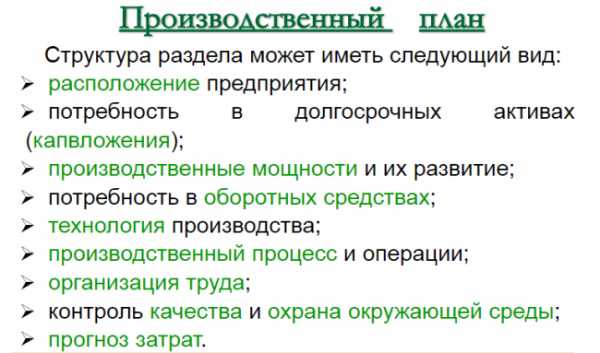 В разделе, который посвящен плану производства, содержится описание всего технологического процесса. Эта часть бизнес-плана нужна только тем предпринимателям, что хотят заняться изготовлением продукции.