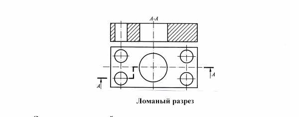 Сложные разрезы обозначаются как и простые, но линия сечения имеет перегибы – места перехода от одной секущей плоскости к другой