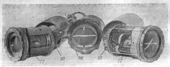 Часто в целях экономии места на приборной доске самолета, которая занята большим количеством приборов, авиационные гироскопические горизонты монтируют в одном корпусе с гироскопическим указателем поворотов. Такой комбинированный прибор (рис.34) совмещает гироскопический горизонт ГГ, гироскопический указатель поворотов УП и маятниковый креномер МК.