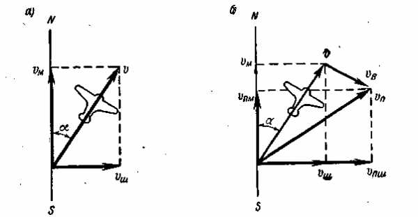На величину скорости движения самолета относительно земной поверхности большое влияние оказывают ветры. Если скорость ветра, совпадает с воздушной скоростью самолета, то его суммарная (путевая) скорость относительно земной поверхности увеличивается. Когда воздушная скорость самолета и скорость ветра противоположны, путевая соответственно уменьшается. В общем случае скорость ветра vB порождает боковой снос самолета, вызывая его отклонение от заданного направления полета. В итоге путевая скорость vn самолета будет определяться геометрической суммой двух скоростей: воздушной скорости v самолета и скорости ветра uв (рис.36, б).