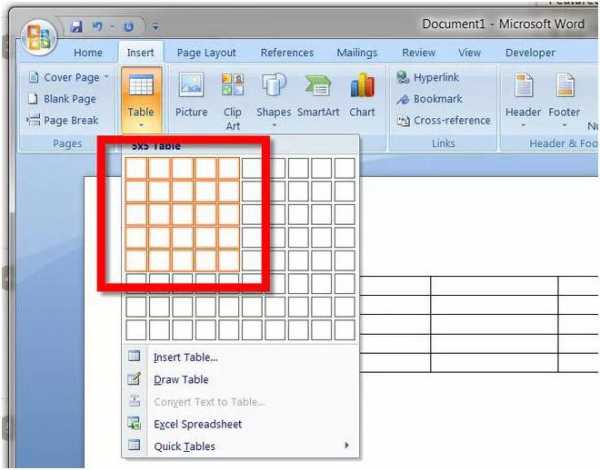 Заходим в «Вставка»- «Таблица» и нам открывается 5 различных способов построения таблиц: