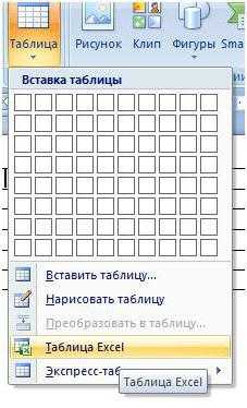 В меню «Таблица» выберите пункт «Вставка» для 07, 10 и 13 версий ворда, а для word 2003 выберите кнопку «Таблица Excel».