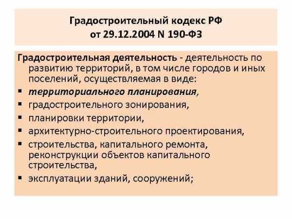 Градостроительный кодекс РФ от 29. 12. 2004 N 190 -ФЗ Градостроительная деятельность – деятельность по развитию территорий, в том числе городов и иных поселений, осуществляемая в виде: § территориального планирования, § градостроительного зонирования, § планировки территории, § архитектурно-строительного проектирования, § строительства, капитального ремонта, реконструкции объектов капитального строительства, § эксплуатации зданий, сооружений;